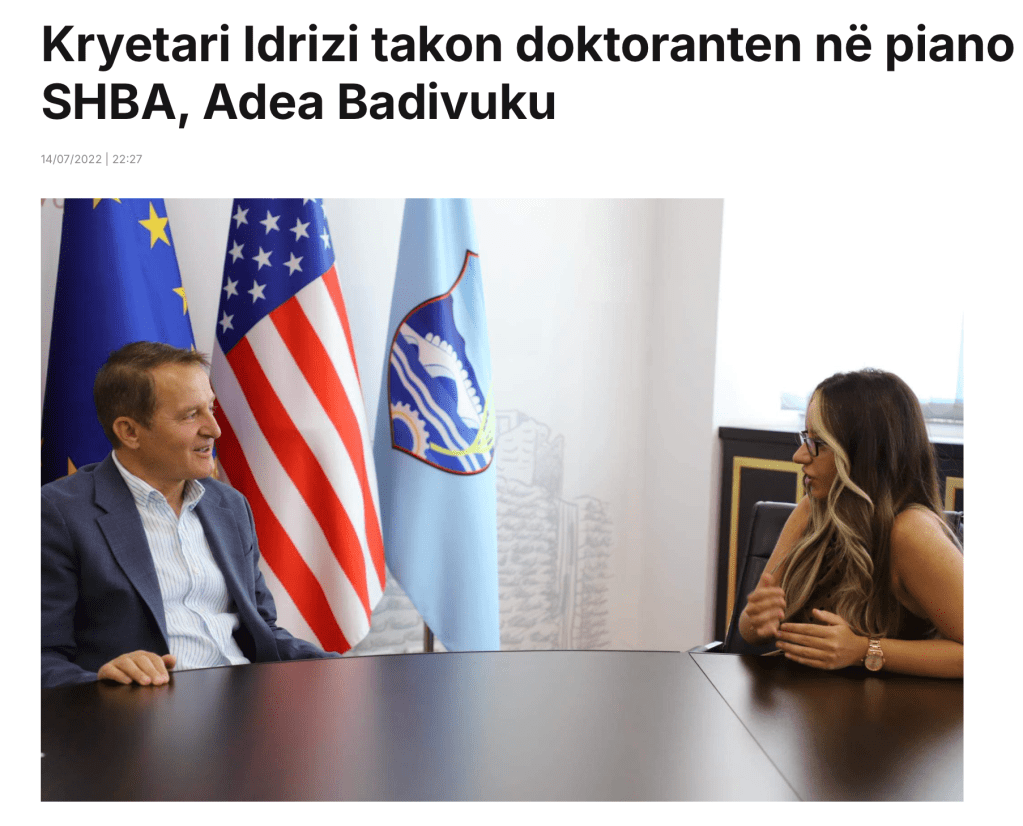 October 26, 2024adeabadivukuLeave a Comment on “Mayor Idrizi meets Adea Badivuku, a doctorate in piano in the USA” “Mayor Idrizi meets Adea Badivuku, a doctorate in piano in the USA” Meeting with Vushtrri’s Municipality Mayor Share this: Click to share on X (Opens in new window) X Click to share on Facebook (Opens in new window) Facebook Like Loading... Related