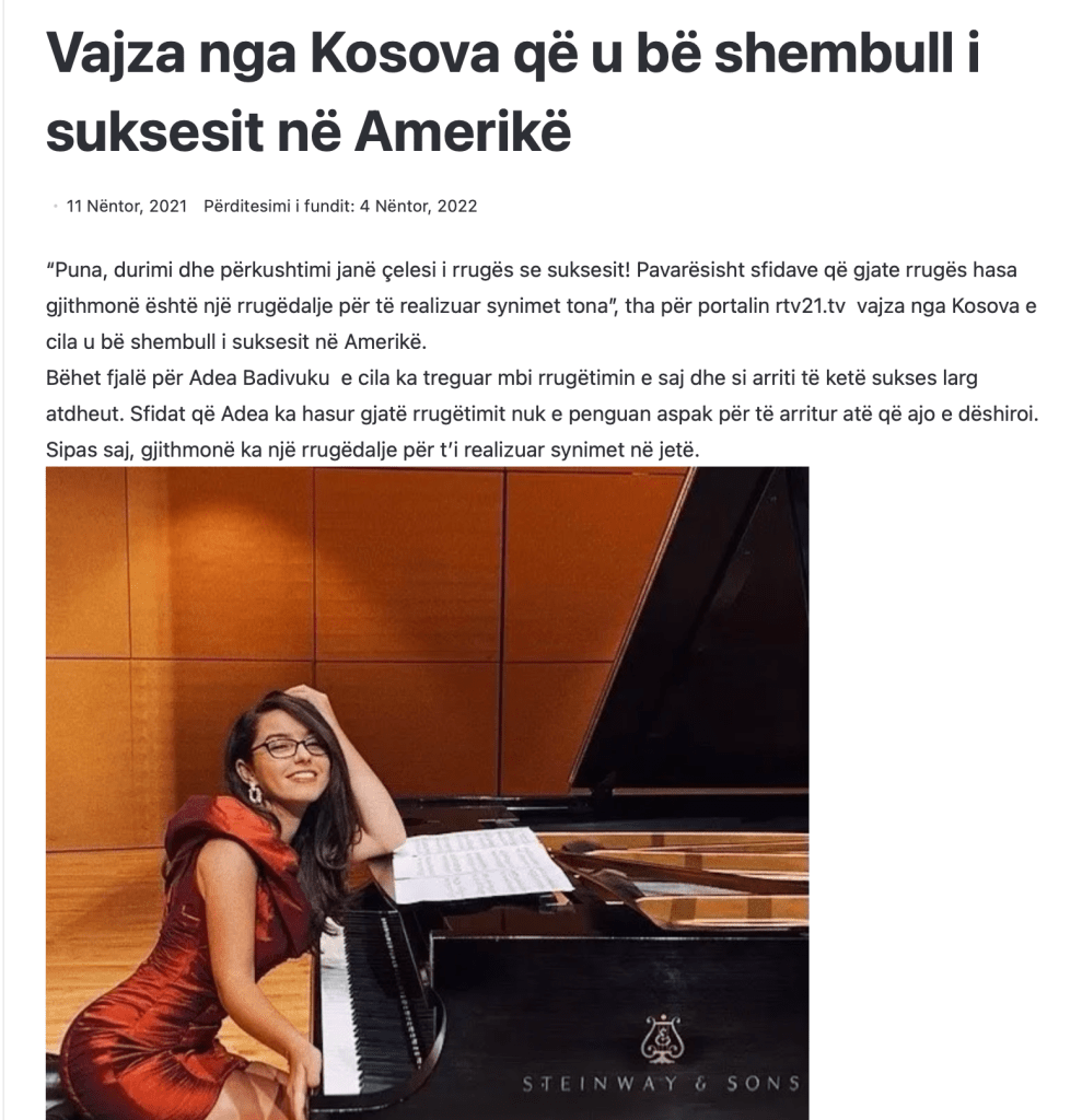 October 26, 2024October 26, 2024adeabadivukuLeave a Comment on “The girl from Kosovo who became an example of success in America” “The girl from Kosovo who became an example of success in America” Accomplishments Share this: Click to share on X (Opens in new window) X Click to share on Facebook (Opens in new window) Facebook Like Loading... Related