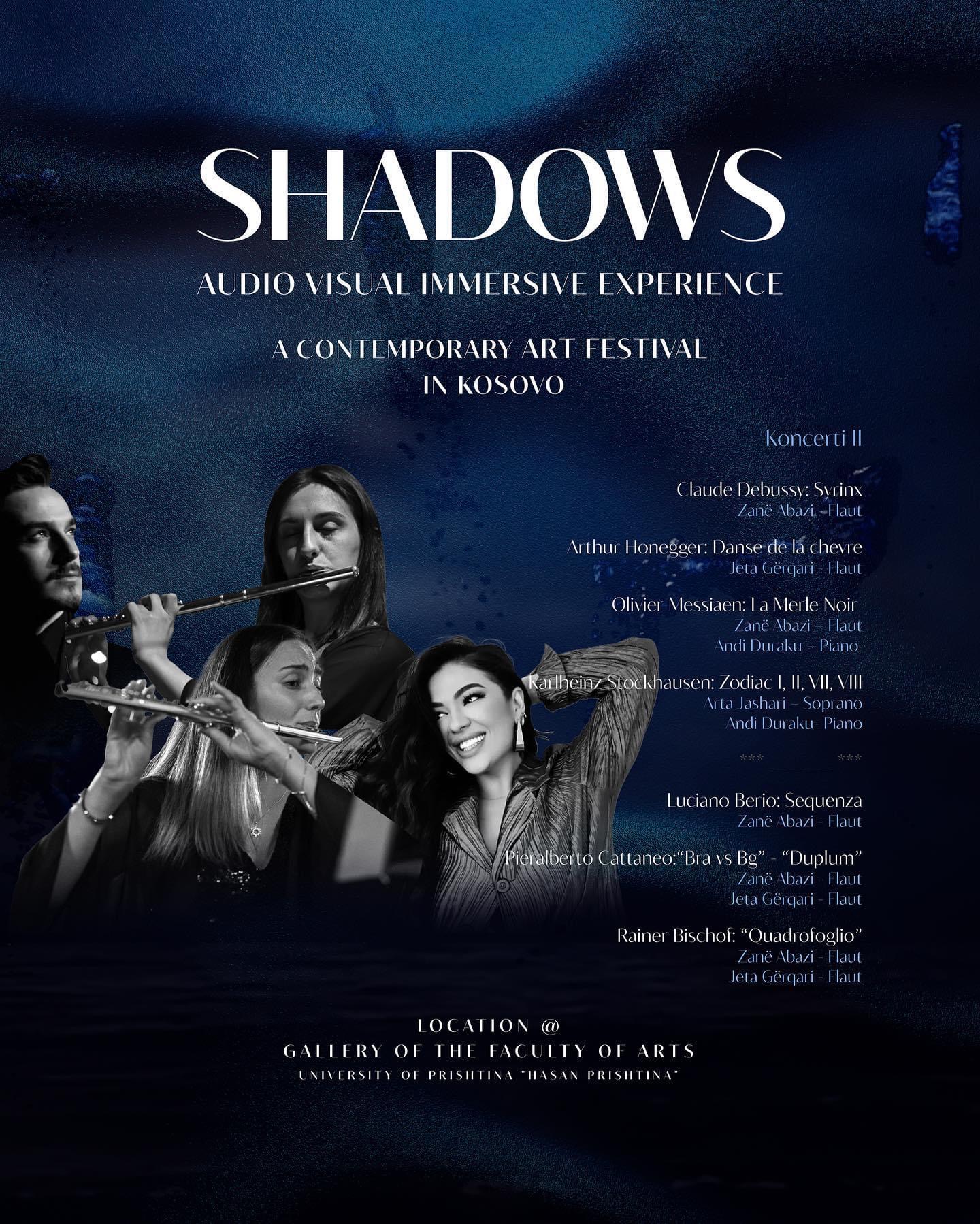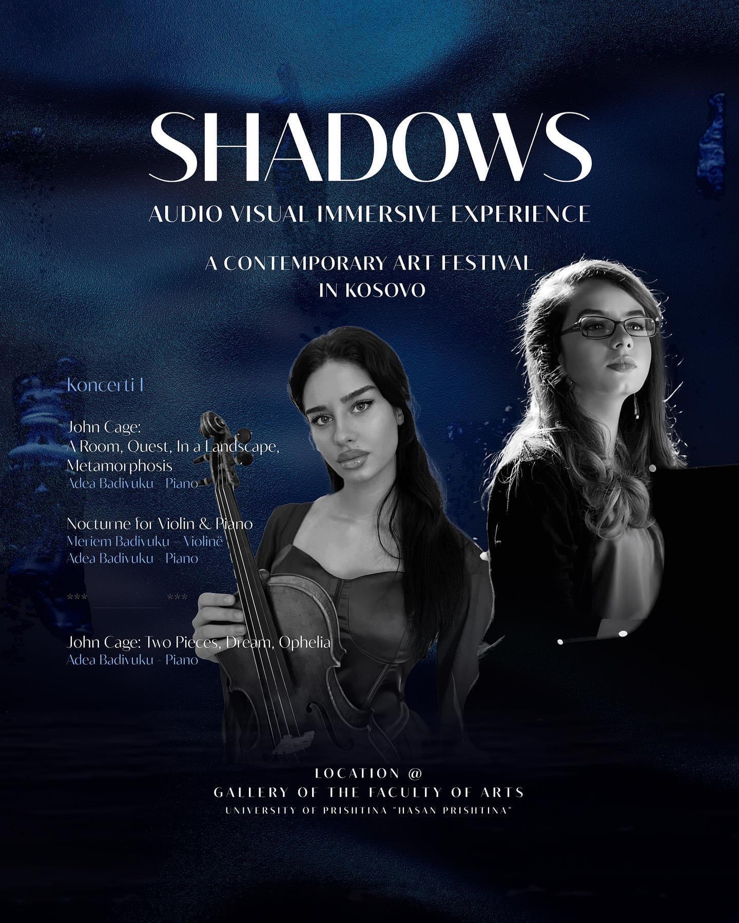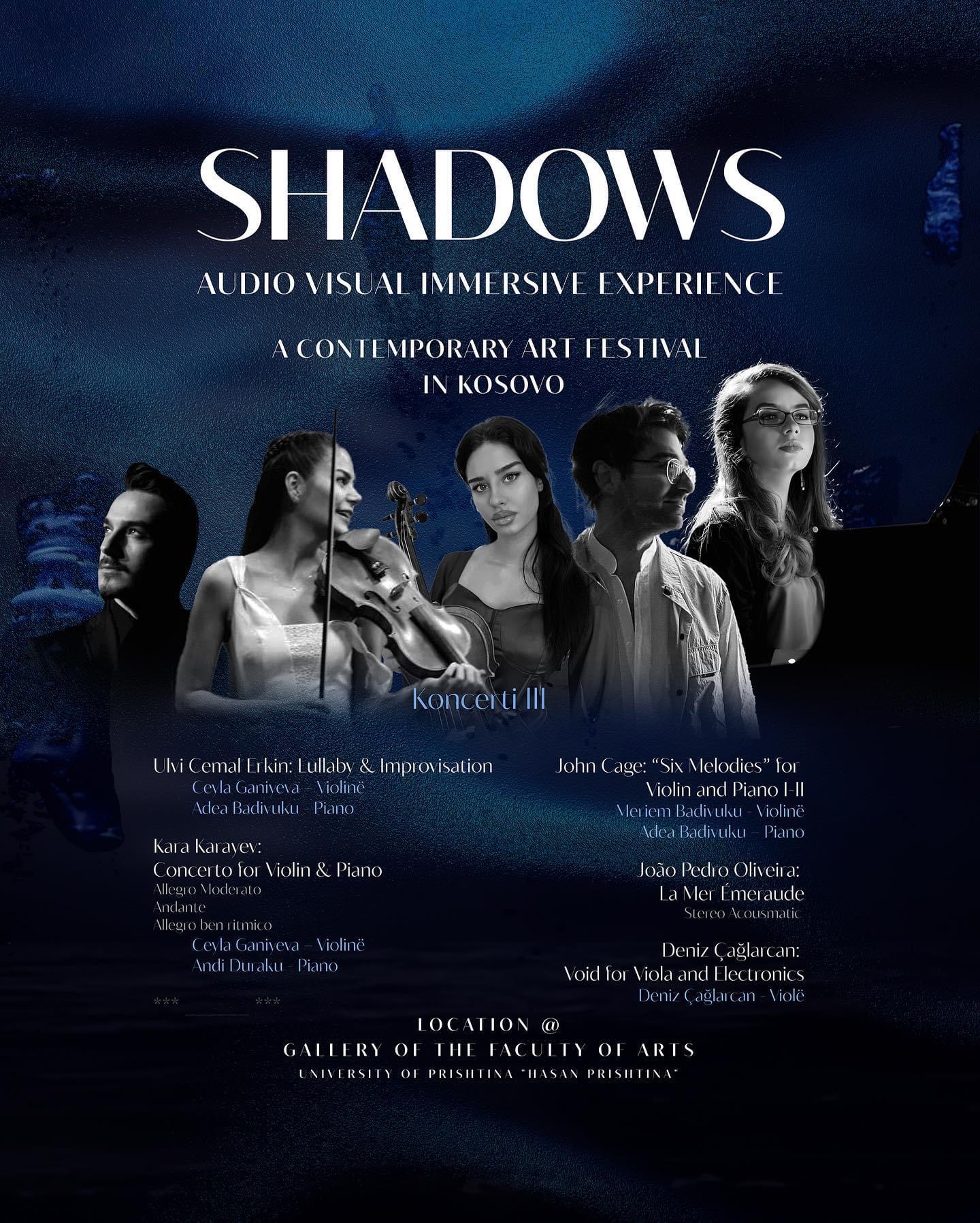 This week-long experience including audio-visual art installation, paintings and concert series is a one-body composition that embraces the audience. The three oil/acrylic paintings, visual music, consisting of three projectors and quadraphonic speaker setup, and the concert series narrate the formal structure of the installation, are all attached to each other and create the Shadows experience. This event was realized with the invitation of the Kosovan pianist Adea Badivuku (President and Organizational Director) to composer Deniz Çağlarcan (Artistic Director) from Los Angeles-USA and painter Güneş Çağlarcan from Istanbul-Turkey. The entire event is a single piece of Composition and was composed by Deniz Çağlarcan.