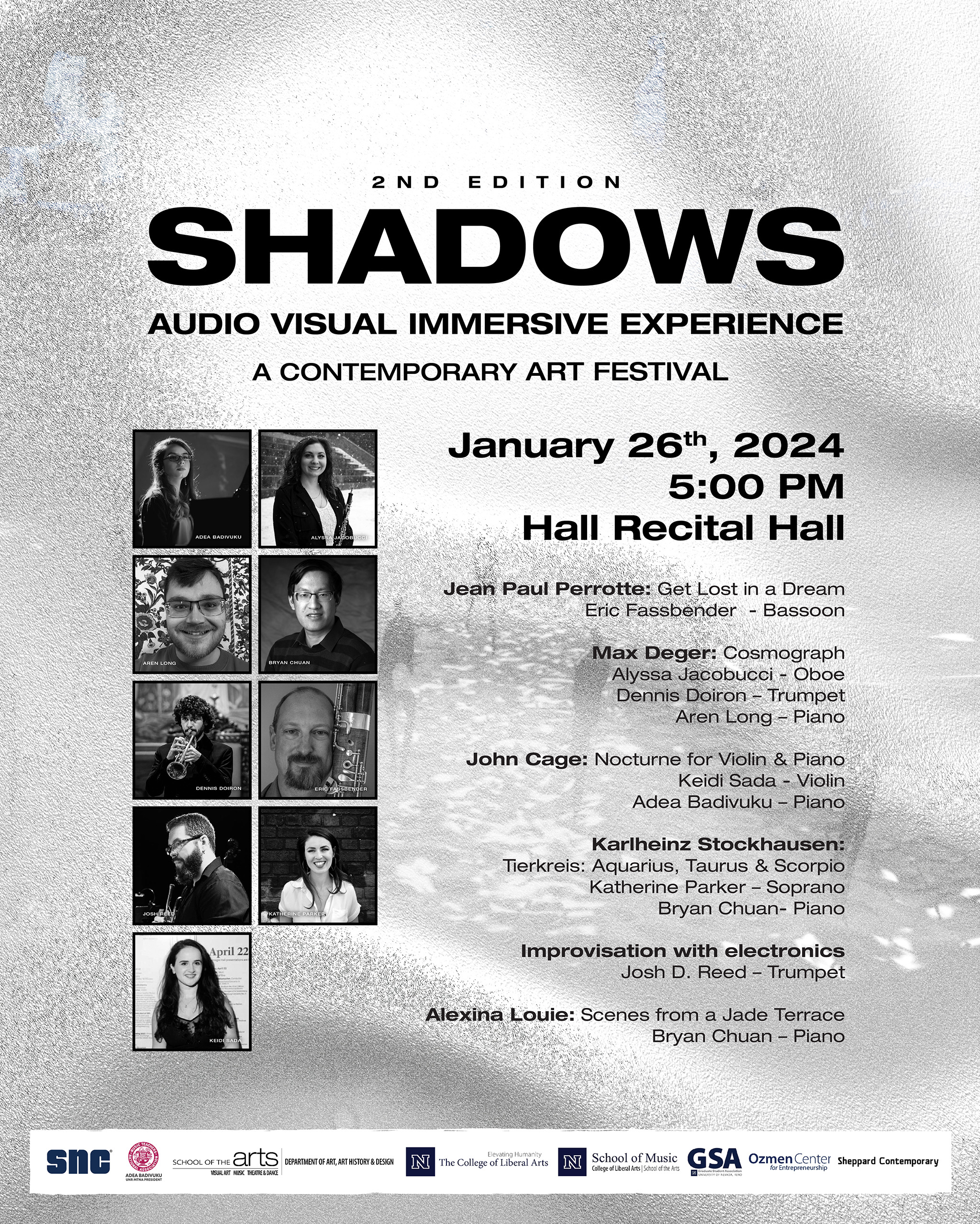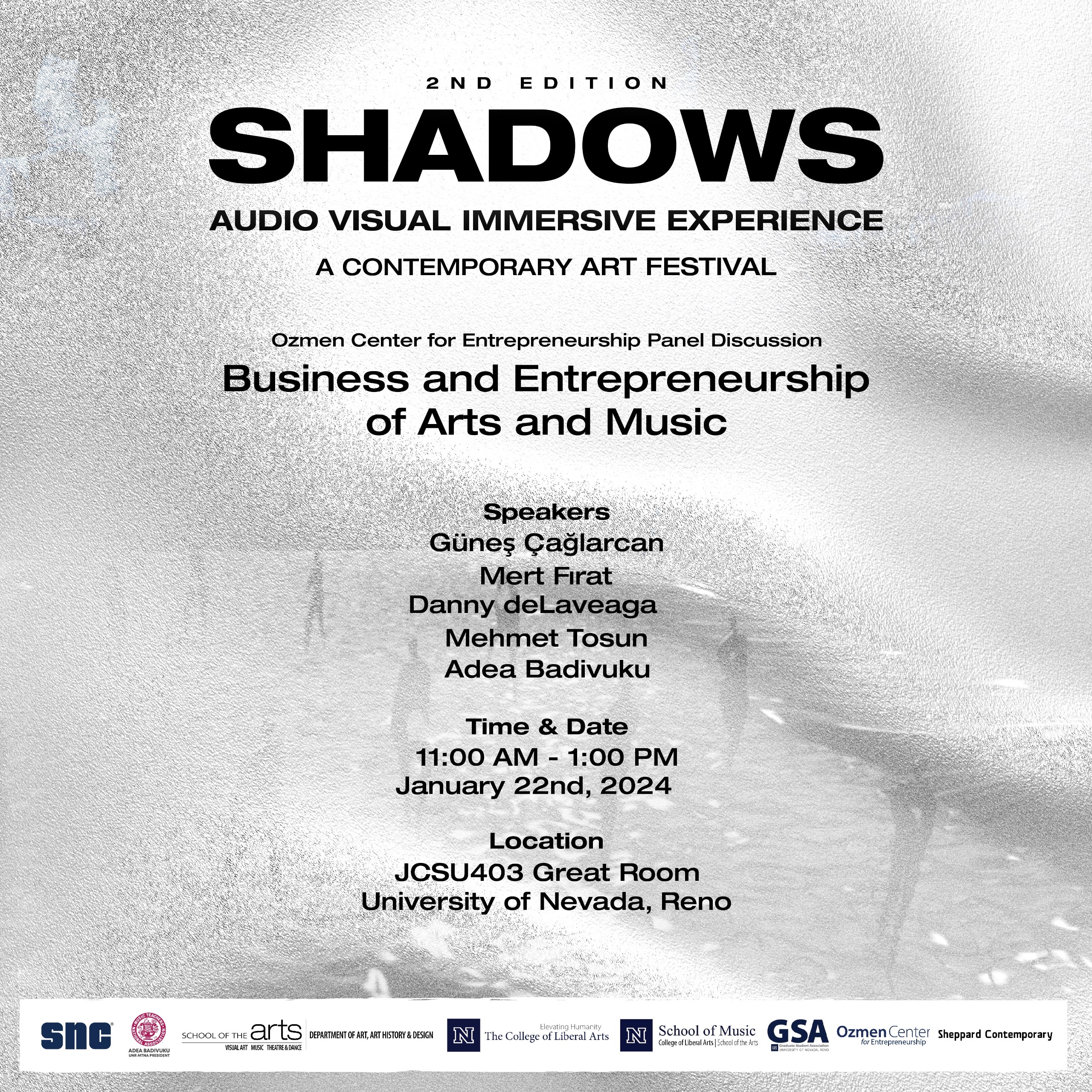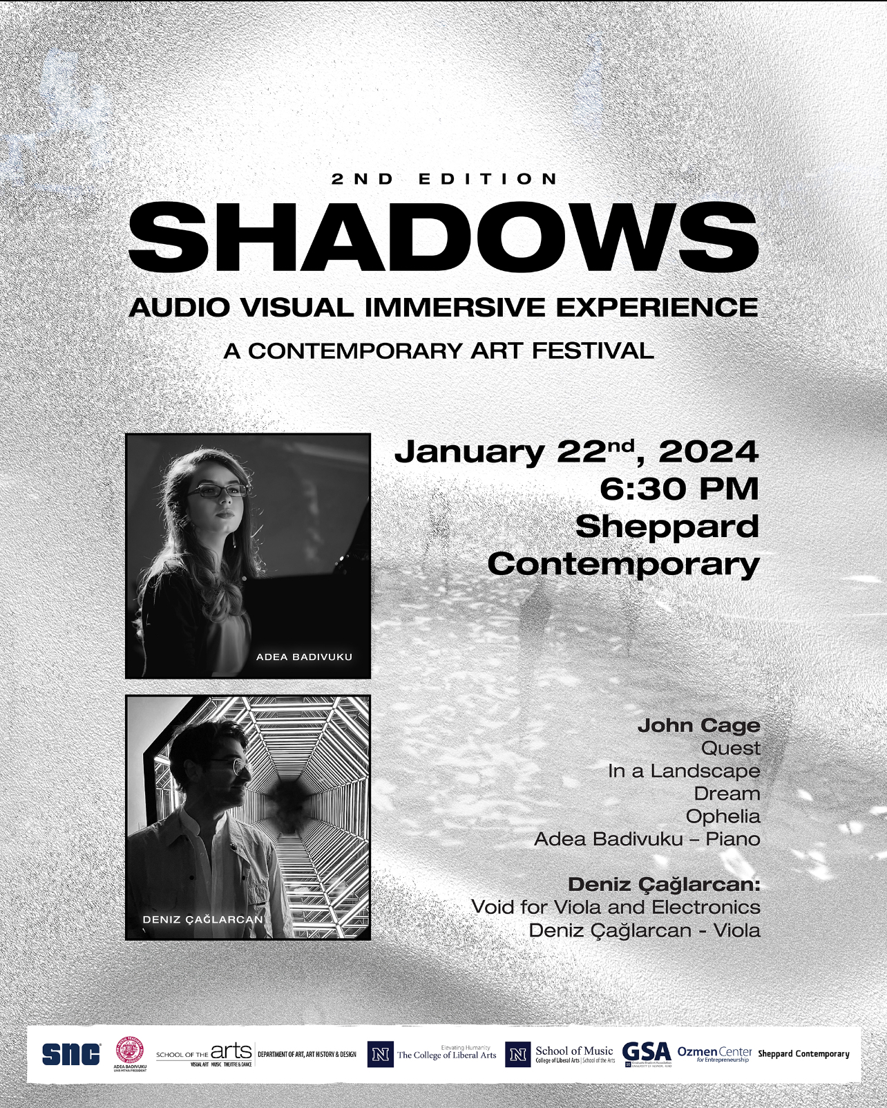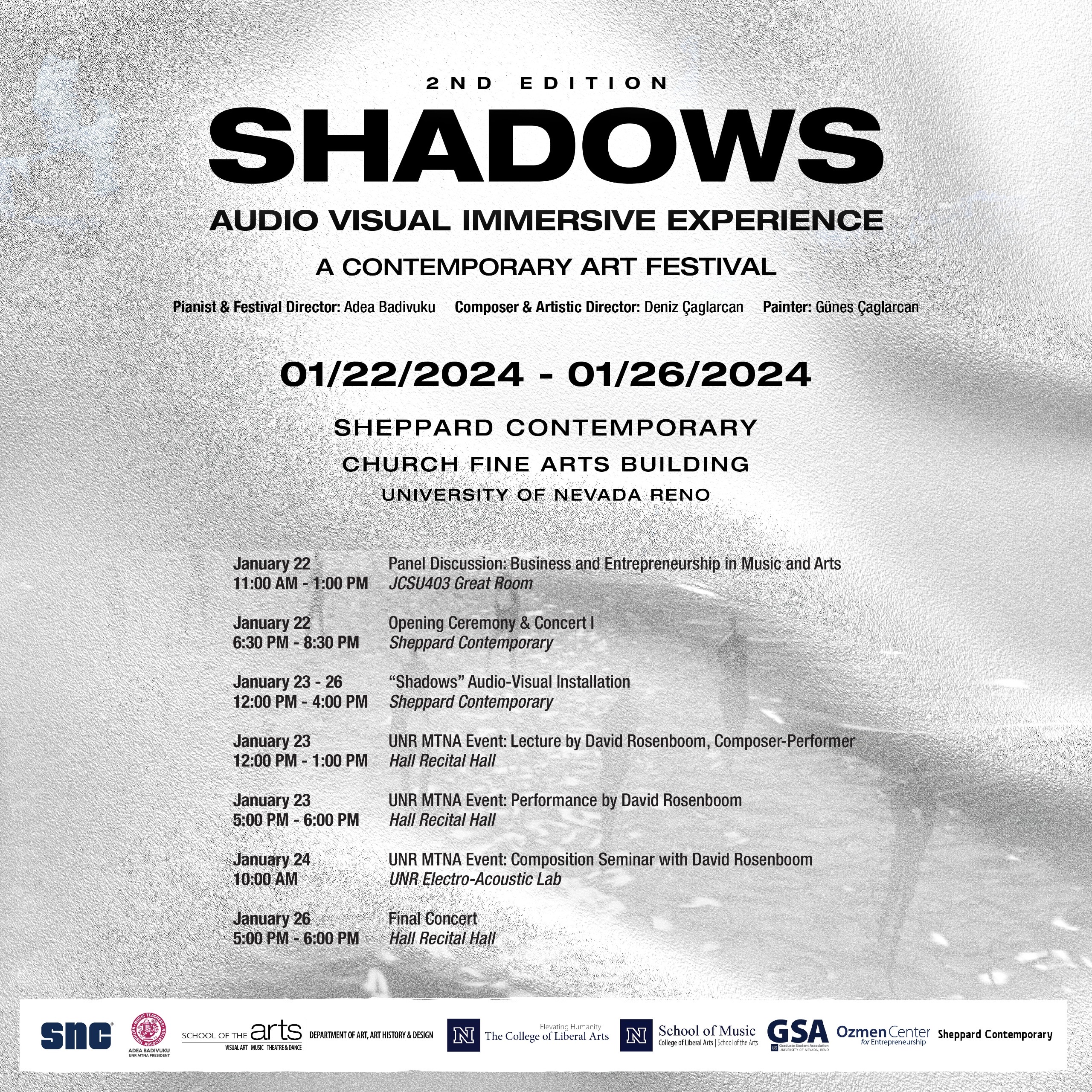 This week-long experience including audio-visual art installation, paintings and concert series is a one-body composition that embraces the audience. The three oil/acrylic paintings, visual music, consisting of three projectors and quadraphonic speaker setup, and the concert series narrate the formal structure of the installation, are all attached to each other and create the Shadows experience. This event was realized with the invitation of the Kosovan pianist Adea Badivuku (President and Organizational Director) to composer Deniz Çağlarcan (Artistic Director) from Los Angeles-USA and painter Güneş Çağlarcan from Istanbul-Turkey. The entire event is a single piece of Composition and was composed by Deniz Çağlarcan.